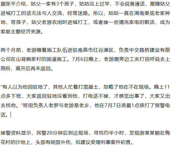 7月6日晚,55岁的湖南娄底籍农民工老游,在江西南昌施工工地附近被枪击身亡。出事前,老游曾离开工地上厕所,3个小时后,被民警在附近农田边搜寻到尸体。
